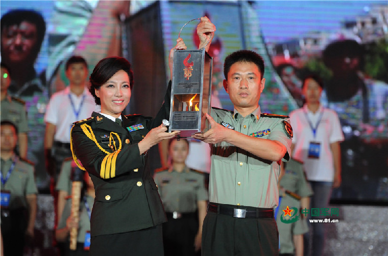 《雄关漫道--纪念长征胜利80周年》主题宣传融媒体报道启动仪式现场,这是主持人和军事记者高举火种灯。记者王传顺摄影