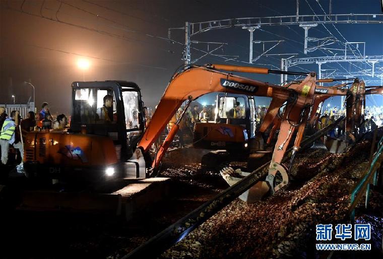 8月3日,大型机械在曹古寺线路所附近施工现场拆除旧的钢轨。