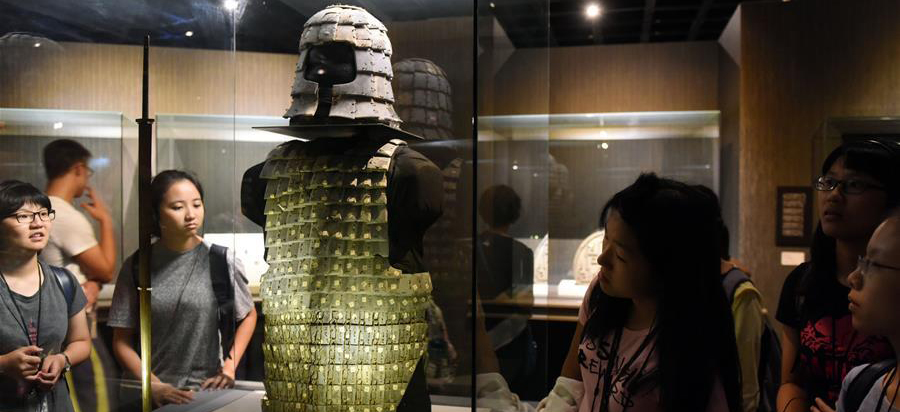 8月9日,游客在台北故宫博物院参观陕西省西安市秦始皇陵陪葬坑出土的石甲胄。汇集两岸多家考古单位“镇馆之宝”的“秦·俑—秦文化与兵马俑特展”,自5月于台北故宫博物院开展以来好评不断。此次展览由台北故宫博物院、台湾科学工艺博物馆与陕西省文物交流中心、甘肃省文物数据信息中心、时艺多媒体传播公司等联合主办,汇集20家博物考古单位的馆藏共189组,在近300件文物中37%以上为一级文物。其中还包含近几年最新的考古发现,许多都是首次在台展出。新华社记者宋振平摄
