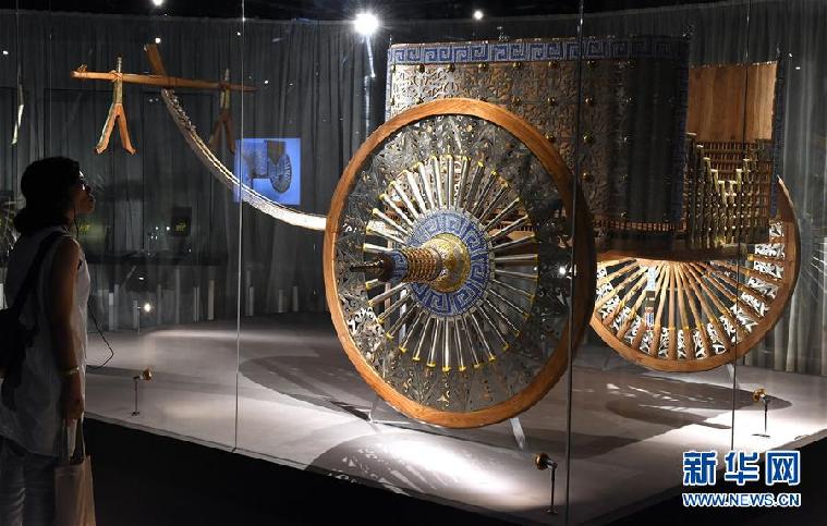 8月9日,游客在台北故宫博物院参观战国晚期西戎贵族马车(复原模型)。汇集两岸多家考古单位“镇馆之宝”的“秦·俑—秦文化与兵马俑特展”,自5月于台北故宫博物院开展以来好评不断。此次展览由台北故宫博物院、台湾科学工艺博物馆与陕西省文物交流中心、甘肃省文物数据信息中心、时艺多媒体传播公司等联合主办,汇集20家博物考古单位的馆藏共189组,在近300件文物中37%以上为一级文物。其中还包含近几年最新的考古发现,许多都是首次在台展出。新华社记者宋振平摄