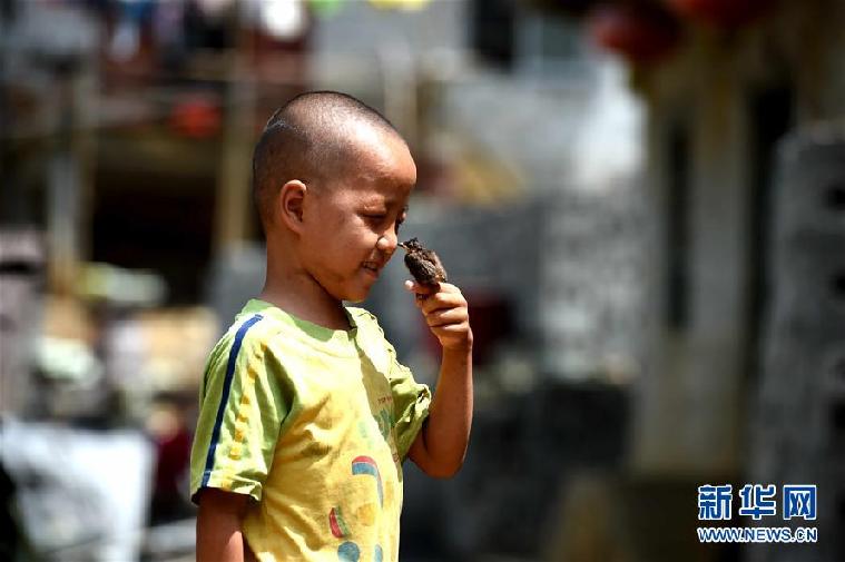 在广西大化板升乡弄勇村弄顶屯,7岁的蓝锦建和他的“小伙伴”在一起玩耍。他家是弄顶屯第一个购买汽车的家庭,蓝锦建希望爸爸能开车带着他去更远的地方看看(8月8日摄)。