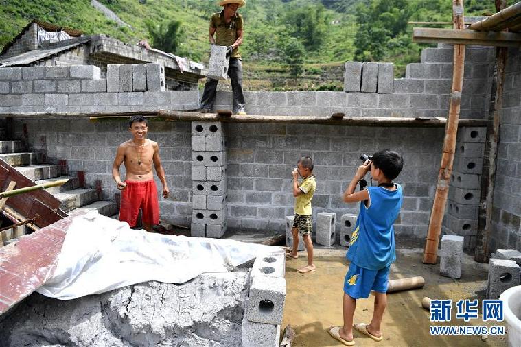 在广西大化板升乡弄勇村,12岁的蒙宣汰(右一)、8岁的蒙宣宏在学习使用相机记录村民的生活。他们使用的相机是北京一个公益组织捐赠给学校的,用于培养孩子们的摄影兴趣(8月7日摄)。