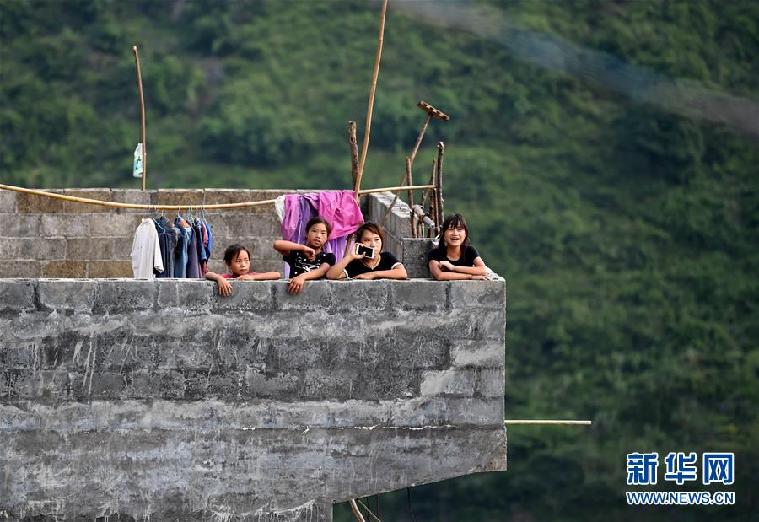 在广西大化七百弄乡弄腾村,从山里搬迁至公路边的女孩在新房楼顶看风景(8月7日摄)。