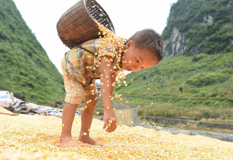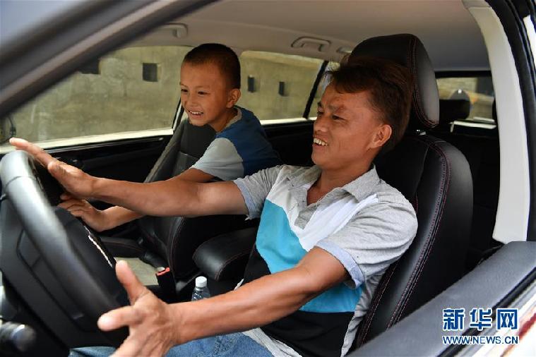 8岁的蒙宣宏和爸爸蒙桂林在新买的车上,这是村里第3个拥有小汽车的家庭。蒙桂林和爱人常年在广东打拼,蒙宣宏和姐姐留守在家。姐姐今年将到乡里读初中,无法照顾弟弟蒙宣宏。因此蒙桂林决定9月份将把蒙宣宏带去广东读书(8月8日摄)。