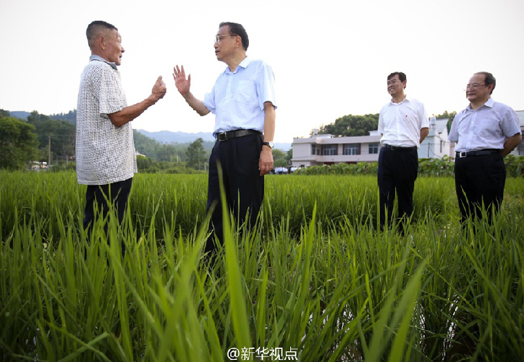 李克强22日在江西瑞金考察途中,经过一处稻田时,总理临时要求停车。他下车走进田间察看水稻长势,随机向沿途多位农民了解今年稻谷收购价格和农民种粮收入状况。李克强对随行相关负责人说,下一步要完善粮食流通和价格机制,保护农民种粮的合理收益。