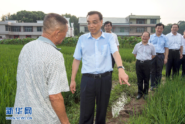 这是8月22日,李克强在瑞金考察途中,临时停车走进稻田与农民交谈,询问粮食收购价格和种粮收入。 新华社记者 谢环驰 摄