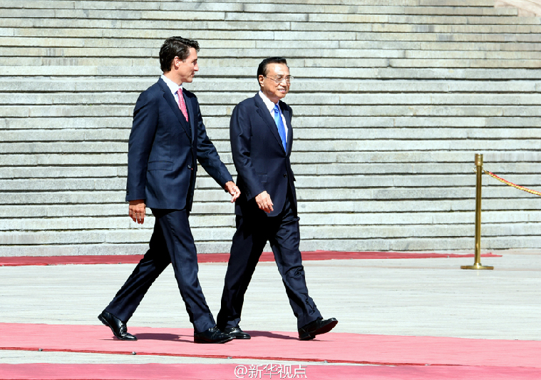 新华网北京8月31日电 李克强总理31日在人民大会堂东门外广场举行仪式,欢迎来华正式访问并出席G20杭州峰会的加拿大总理特鲁多。会谈中,双方决定建立中加总理年度对话机制,一致同意本着相互尊重、平等相待的精神,抓住机遇,深挖潜力,开创中加关系和各领域务实合作的新时代。(据新华社“新华视点”微博报道)