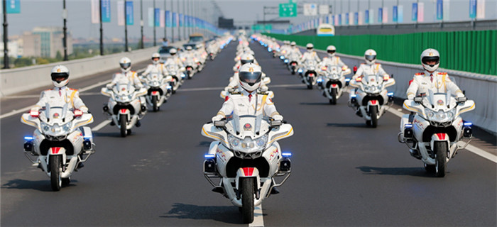 在欢迎各国元首参加G20峰会到访的仪式上,身穿洁白礼服、胸佩金黄绥带、脚蹬乌黑马靴的武警官兵动作整齐划一,驾驶着白色摩托车呈“V”字队形,护卫着国宾车队前进。