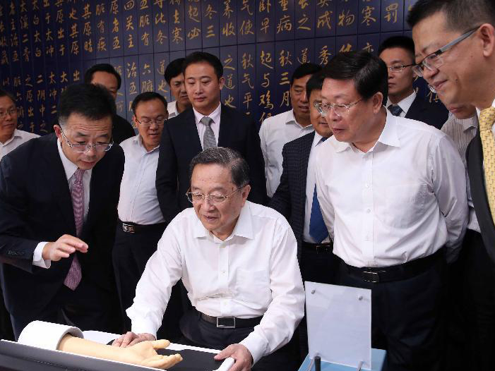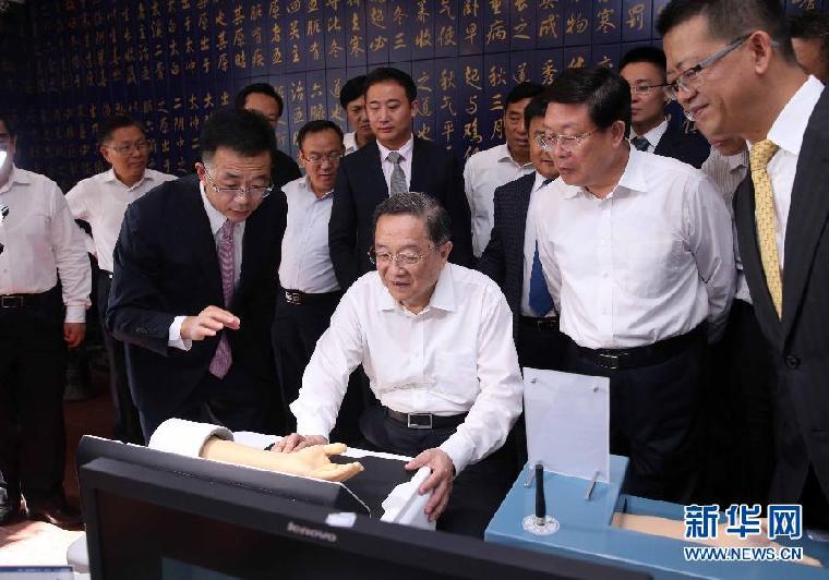 9月5日至6日,中共中央政治局常委、全国政协主席俞正声在天津调研。这是9月5日,俞正声在天堰医教科技发展有限公司了解企业产品研发等情况。新华社记者 刘卫兵 摄