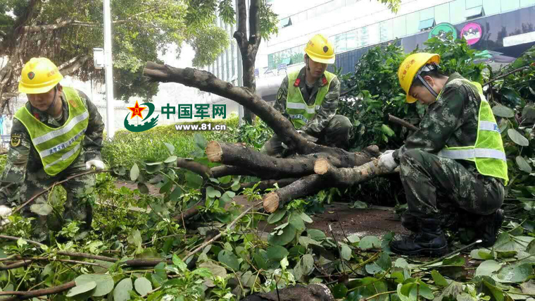 为尽快清理被台风破坏损毁园林树木,帮助厦门旅游产业尽快恢复正常,9月17日20时许,接上级命令,武警交通三总队八支队紧急出动第一梯队200名官兵、机械设备35台(套),连夜驰援厦门。据八支队何成太支队长介绍,部队在完成福州闽侯廷萍乡X143县道、大湖乡堤坝泄洪排险任务后,携带自卸车、装载机、手持式自动伐木机立刻奔赴厦门。18日凌晨在到达厦门后,分三个梯队分别对筼筜湖沿岸和江头公园沿岸树木切割、转运和清理。18日上午,厦门市某公司设计师蒋学钻找到正在开展清理工作的官兵,请求帮助处理被树木砸压的汽车,廖锋云大队长带战士前往事发地,利用手持式自动伐木机锯断直径约15厘米树木,帮助被压汽车脱困,姜学钻连连鞠躬,表示感谢。