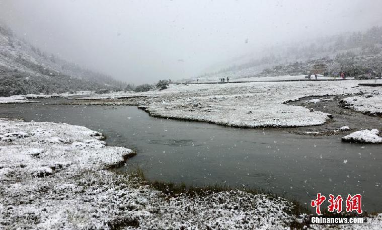 9月20日,受冷空气影响,四川甘孜州稻城亚丁景区雪花飘舞,大雾弥漫,山峰披上白纱,银装素裹。正在景区内游玩的海内外游客纷纷用手机记录雪景,并拍照留念。图为亚丁景区到处都是白茫茫一片,银装素裹。 钟欣 摄