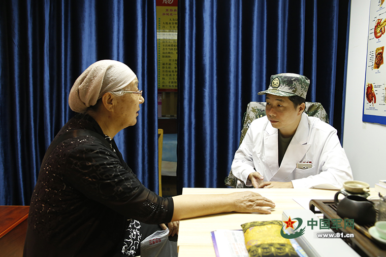 第三军医大学卫生列车医疗队消化内科柏健鹰医生为老人义诊。