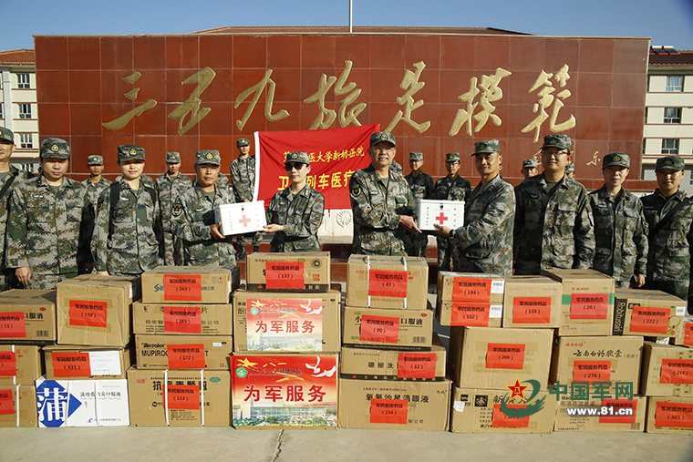 第三军医大学卫生列车医疗队为边防官兵赠送药品。
