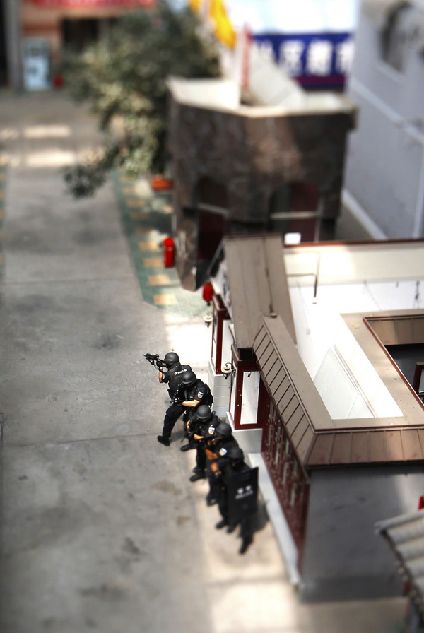 蓝剑突击队员在模拟训练场进行突击队形训练(2016年8月20日移轴镜头拍摄)。 新华社记者 殷刚 摄