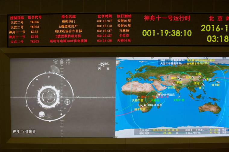 10月19日凌晨,神舟十一号飞船与天宫二号自动交会对接成功。这是神舟十一号飞船与天宫二号相距20米时的画面(摄于北京航天飞行控制中心大屏幕)。新华社记者 琚振华 摄