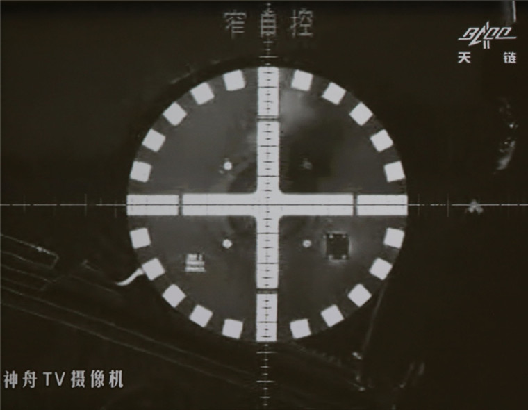 10月19日凌晨,神舟十一号飞船与天宫二号自动交会对接成功。这是神舟十一号与天宫二号对接时画面(摄于北京航天飞行控制中心大屏幕)。新华社记者 琚振华 摄