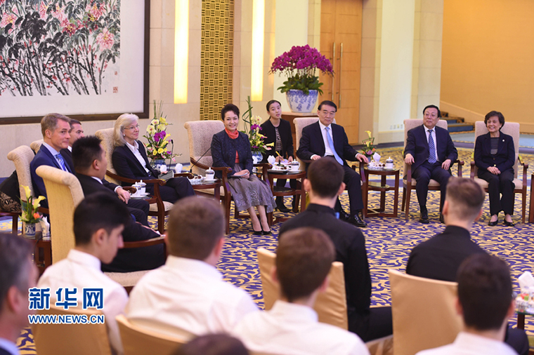 10月19日,中国国家主席习近平夫人彭丽媛在北京钓鱼台国宾馆会见德国伯乐高级文理中学师生。 新华社记者 谢环驰 摄