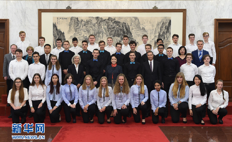 10月19日,中国国家主席习近平夫人彭丽媛在北京钓鱼台国宾馆会见德国伯乐高级文理中学师生。 新华社记者 谢环驰 摄
