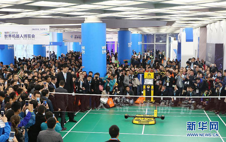 10月20日,一款会打羽毛球的机器人吸引众多观众驻足。当日,2016世界机器人大会在北京开幕。此次世界机器人大会以“共创共享共赢,开启智能时代”为主题,近150家全球知名机器人企业参会。新华社记者 裴鑫 摄
