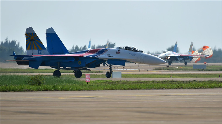 10月26日,俄罗斯“勇士”特技飞行表演队苏-27表演机在珠海机场降落。当日,俄罗斯“勇士”特技飞行表演队5架苏-27表演机、1架伊尔-76保障机抵达珠海机场。他们将在11月1日至6日举行的第十一届中国国际航空航天博览会上进行表演。新华社记者 梁旭 摄