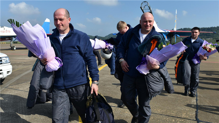 10月26日,俄罗斯“勇士”特技飞行表演队的飞行员们走下飞机。当日,俄罗斯“勇士”特技飞行表演队5架苏-27表演机、1架伊尔-76保障机抵达珠海机场。他们将在11月1日至6日举行的第十一届中国国际航空航天博览会上进行表演。新华社记者 梁旭 摄