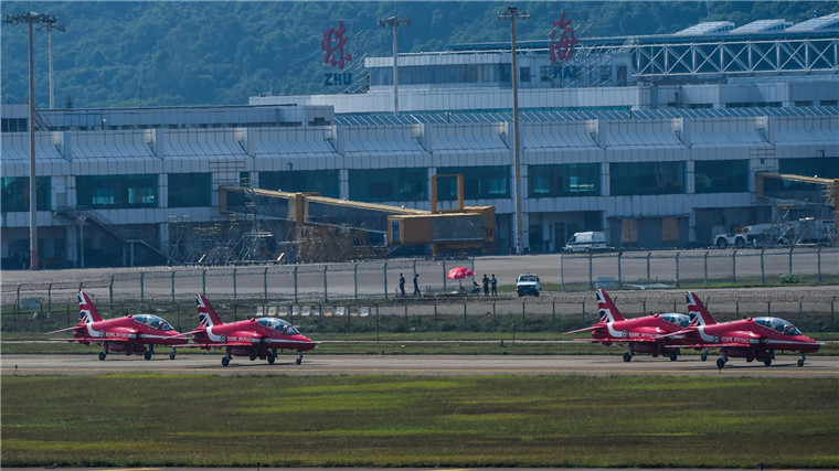 10月22日,英国皇家空军红箭飞行表演队的飞机降落后经过珠海机场航站楼。当日,参加第十一届中国国际航空航天博览会的英国皇家空军红箭飞行表演队的12架HAWK喷气式飞机降落在珠海机场。新华社记者刘大伟摄