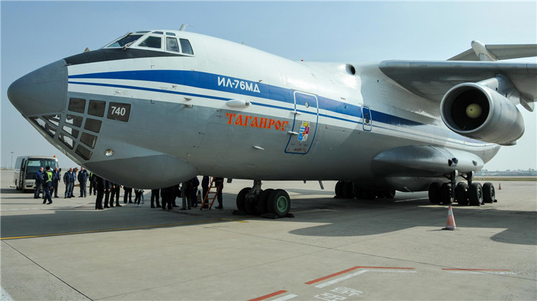 10月25日,伊尔-76保障机停靠在呼和浩特白塔国际机场。当日,俄罗斯“勇士”特技飞行表演队5架苏-27表演机、1架伊尔-76保障机降落在内蒙古呼和浩特白塔国际机场。他们将在呼和浩特停留补给后飞往广东珠海,参加11月1日至6日举行的第十一届中国国际航空航天博览会。新华社记者 连振 摄