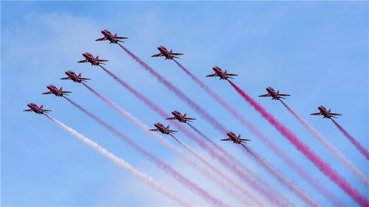 10月22日,英国皇家空军红箭飞行表演队的12架飞机降落前编队经过珠海机场上空。当日,参加第十一届中国国际航空航天博览会的英国皇家空军红箭飞行表演队的12架HAWK喷气式飞机降落在珠海机场。新华社记者刘大伟摄