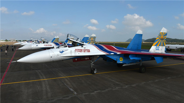 10月26日,俄罗斯“勇士”特技飞行表演队5架苏-27表演机停放在珠海机场。当日,俄罗斯“勇士”特技飞行表演队5架苏-27表演机、1架伊尔-76保障机抵达珠海机场。他们将在11月1日至6日举行的第十一届中国国际航空航天博览会上进行表演。新华社记者 梁旭 摄