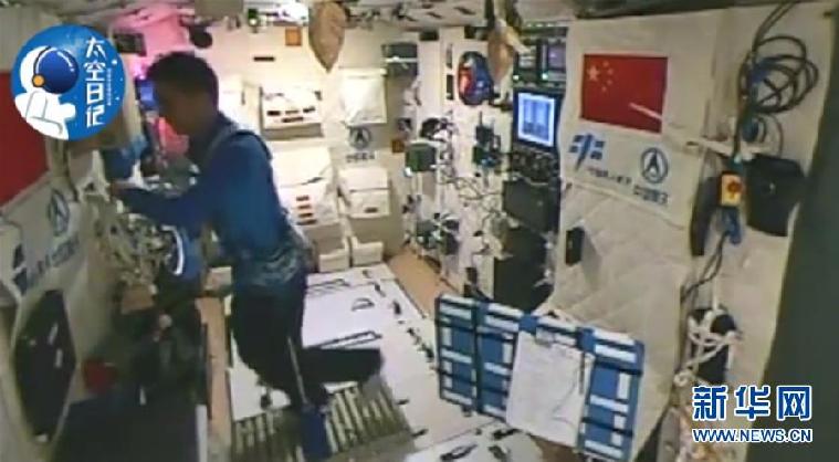 11月7日,新华社太空特约记者、航天员陈冬在天宫二号介绍航天员在太空中怎样锻炼身体,与地面健身相比有哪些不一样的感觉。这是航天员在天宫舱内锻炼。新华社发(中国航天员中心提供)