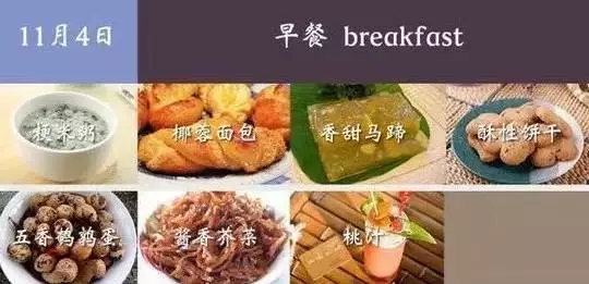 比如早餐,包括粳米粥、椰蓉面包、五香鹌鹑蛋等;