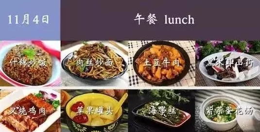 午饭包括什锦炒饭、肉丝炒面、土豆牛肉等;