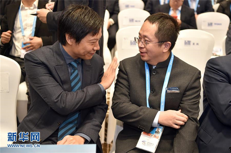11月16日,小米科技董事长雷军(左)和奇虎360董事长周鸿祎在开幕式开始前交流。新华社记者 李鑫 摄
