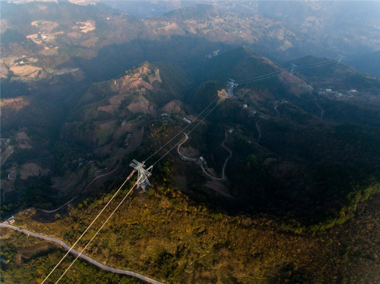 在重庆巫山县骡坪镇航拍验收中的±800千伏特高压线路(12月6日摄)。新华社记者 刘潺 摄