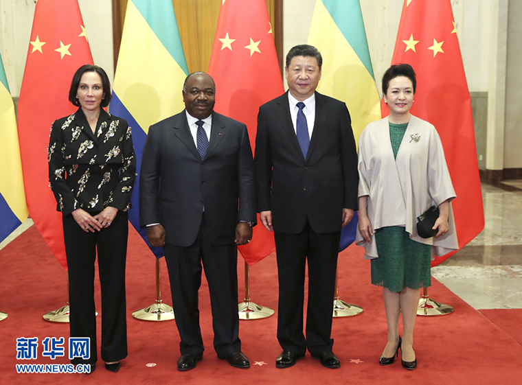 12月7日,国家主席习近平在北京人民大会堂同加蓬总统邦戈举行会谈。会谈前,习近平在人民大会堂北大厅为邦戈举行欢迎仪式。这是习近平和夫人彭丽媛同邦戈总统夫妇合影。新华社记者庞兴雷摄