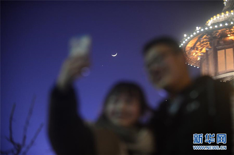 1月2日,江苏扬州市民在文昌阁下合影,夜空中上演“金星合月”天象。