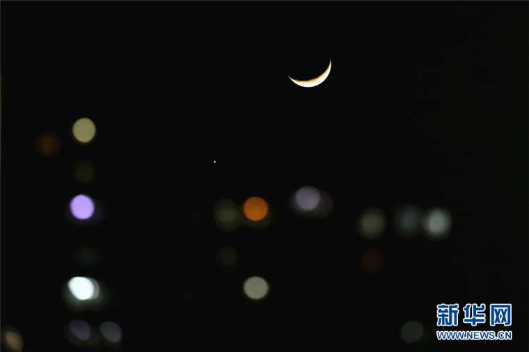 当晚,金星与弯月近距离相会,上演“金星合月”天象。