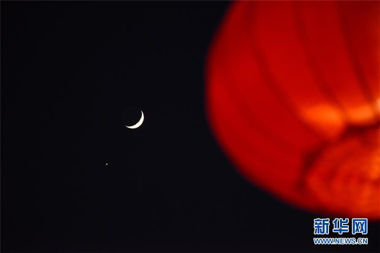 当晚,金星与弯月近距离相会,上演“金星合月”天象。