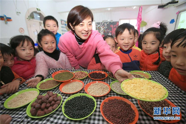 1月4日,河南省开封市群英幼儿园的老师为孩子们讲解熬制腊八粥的食材。当日,河南省开封市群英幼儿园举行“浓情腊八、品赏民俗”活动,喜迎即将到来的“腊八节”。 新华社发(李俊生 摄)