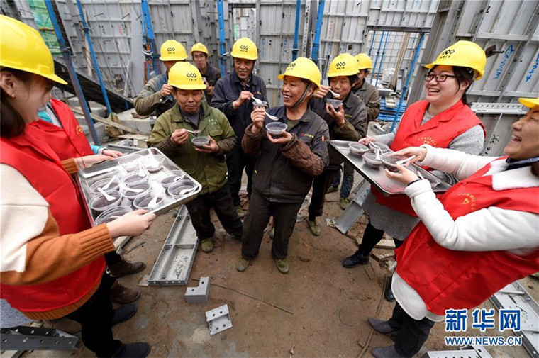 1月4日,在合肥市瑶海区和平路街道繁昌路社区一建筑工地,青年志愿者为农民工建设者们送上热腾腾的腊八粥。当日,合肥市瑶海区繁昌路社区开展“腊八粥送给农民工”活动,喜迎即将到来的“腊八节”。 新华社发(解琛 摄)