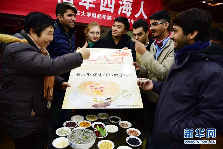 1月4日,社区居民(左)在向外国留学生介绍腊八习俗。当日,江苏大学的20多名留学生走进镇江市金山街道迎江路中心社区,与当地居民一起喜迎即将到来的“腊八节”。 新华社发(石玉成 摄)