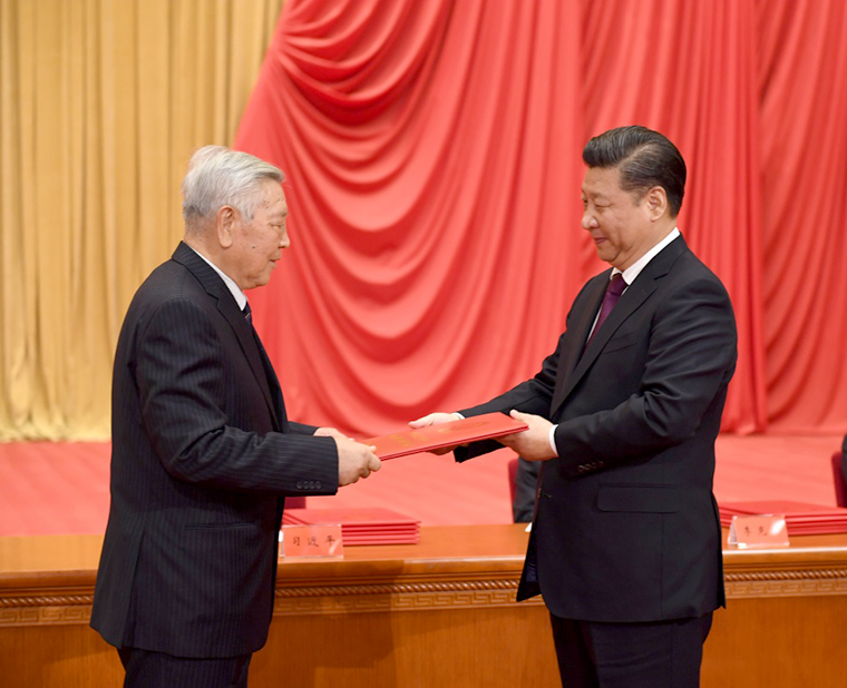 1月9日,2016年度国家科学技术奖励大会在北京人民大会堂隆重举行。中共中央总书记、国家主席、中央军委主席习近平向获得2016年度国家最高科学技术奖的中国科学院物理研究所赵忠贤院士颁奖。新华社记者 李学仁 摄