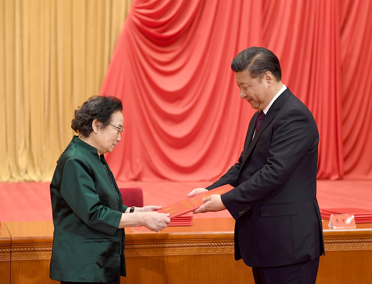 1月9日,2016年度国家科学技术奖励大会在北京人民大会堂隆重举行。中共中央总书记、国家主席、中央军委主席习近平向获得2016年度国家最高科学技术奖的中国中医科学院屠呦呦研究员颁奖。新华社记者 李学仁 摄