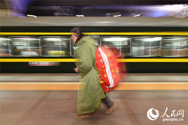 1月13日,旅客检票进站后,向列车飞奔。(人民网记者 翁奇羽 摄)