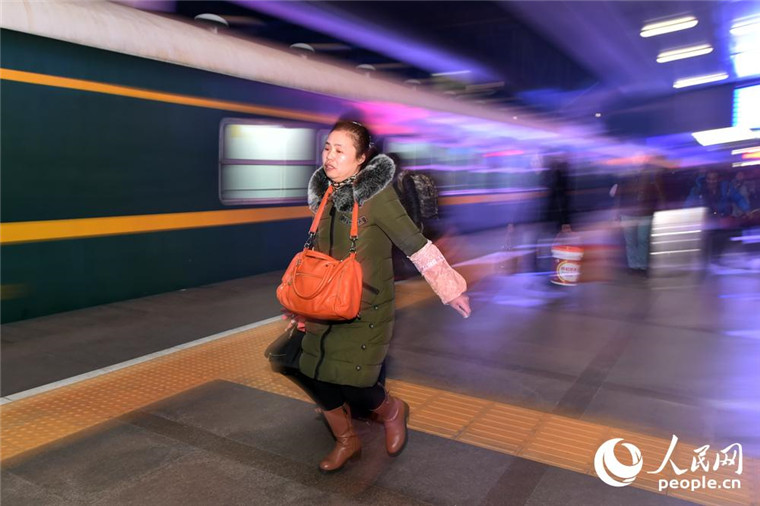 1月13日,旅客检票进站后,向列车飞奔而去。(人民网记者 翁奇羽 摄)