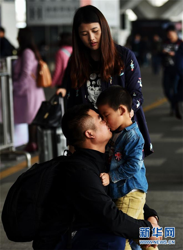 2月2日,在深圳北站,一名父亲与儿子亲吻告别。春节长假即将结束,深圳迎来节后返程高峰。经过春节的短暂团聚,前来深圳探望亲友的旅客踏上归途,上演一幕幕告别的场景。 新华社记者毛思倩摄