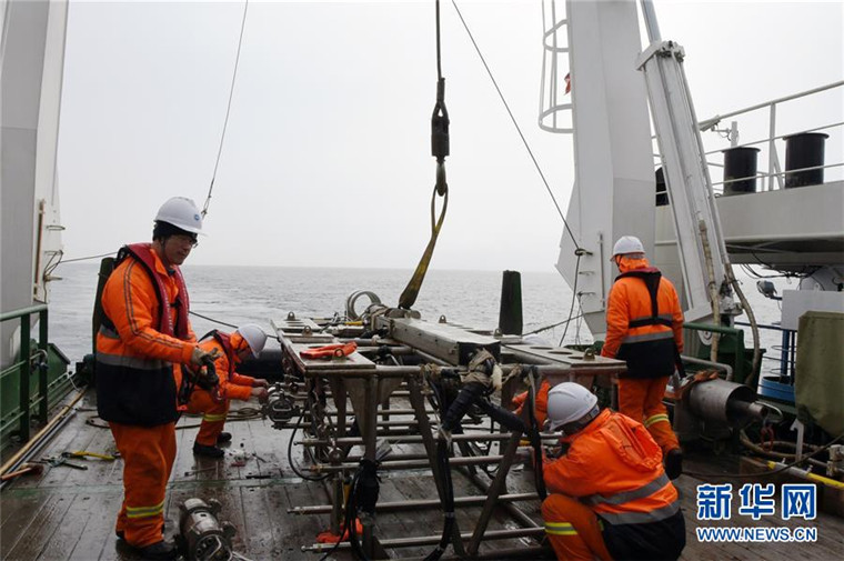 本次“海洋六号”南极科考,是自1990至1991年我国首次南极南大洋综合地质地球物理调查后第二次南极海域综合地质地球物理科学考察。图为科考人员完成多道地震调查后,从后甲板收回科考作业装备。 新华社记者 王攀 摄