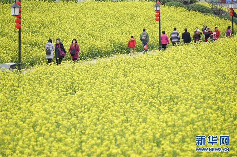 2月2日,游人在福州花海公园盛开的油菜花田赏花。