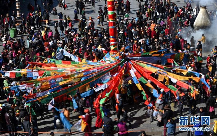 当日,西藏拉萨大昭寺的工作人员依据传统为大昭寺周边的5根高20多米的经杆更换经幡,迎接即将到来的藏历新年。来自各地的信教群众把写有祝福、祈愿的经幡系在经杆上,表达对新年的新希望。