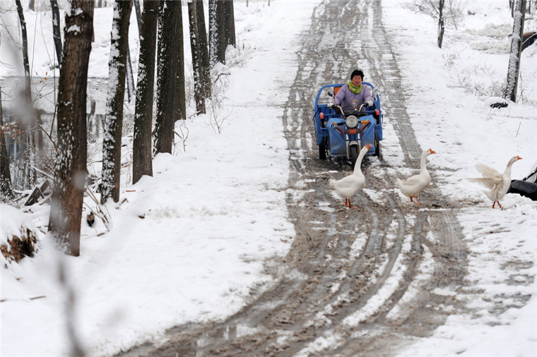 2月8日,安徽省宿州市芦岭镇村民在雪后出行。 新华社发(黄世鹏 摄)